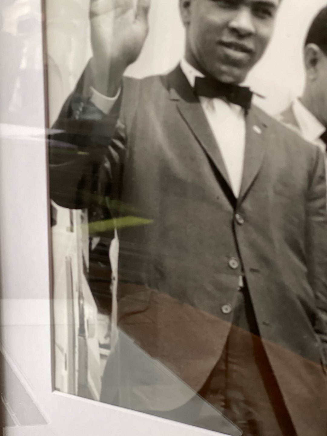 Keystone Photo shows: Cassius Clay gives a wave as he steps off the plane, on arrival at London Airport today."