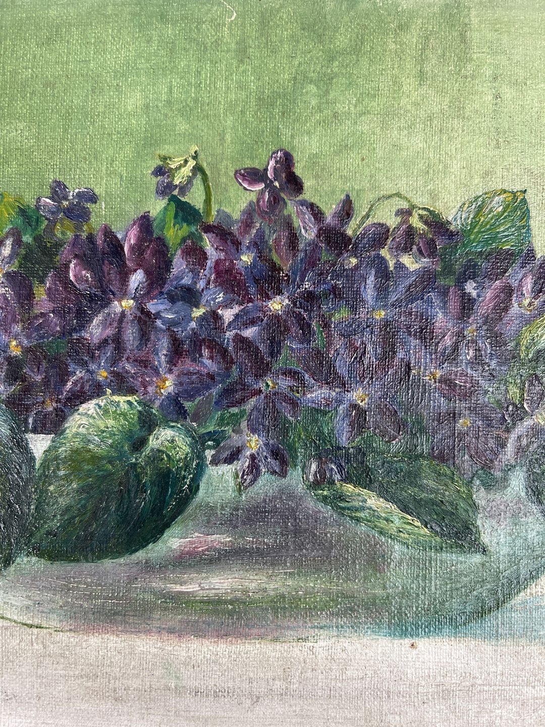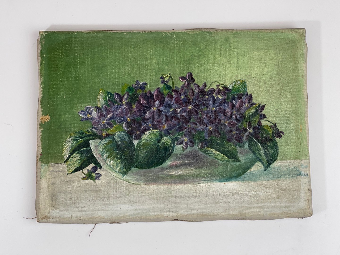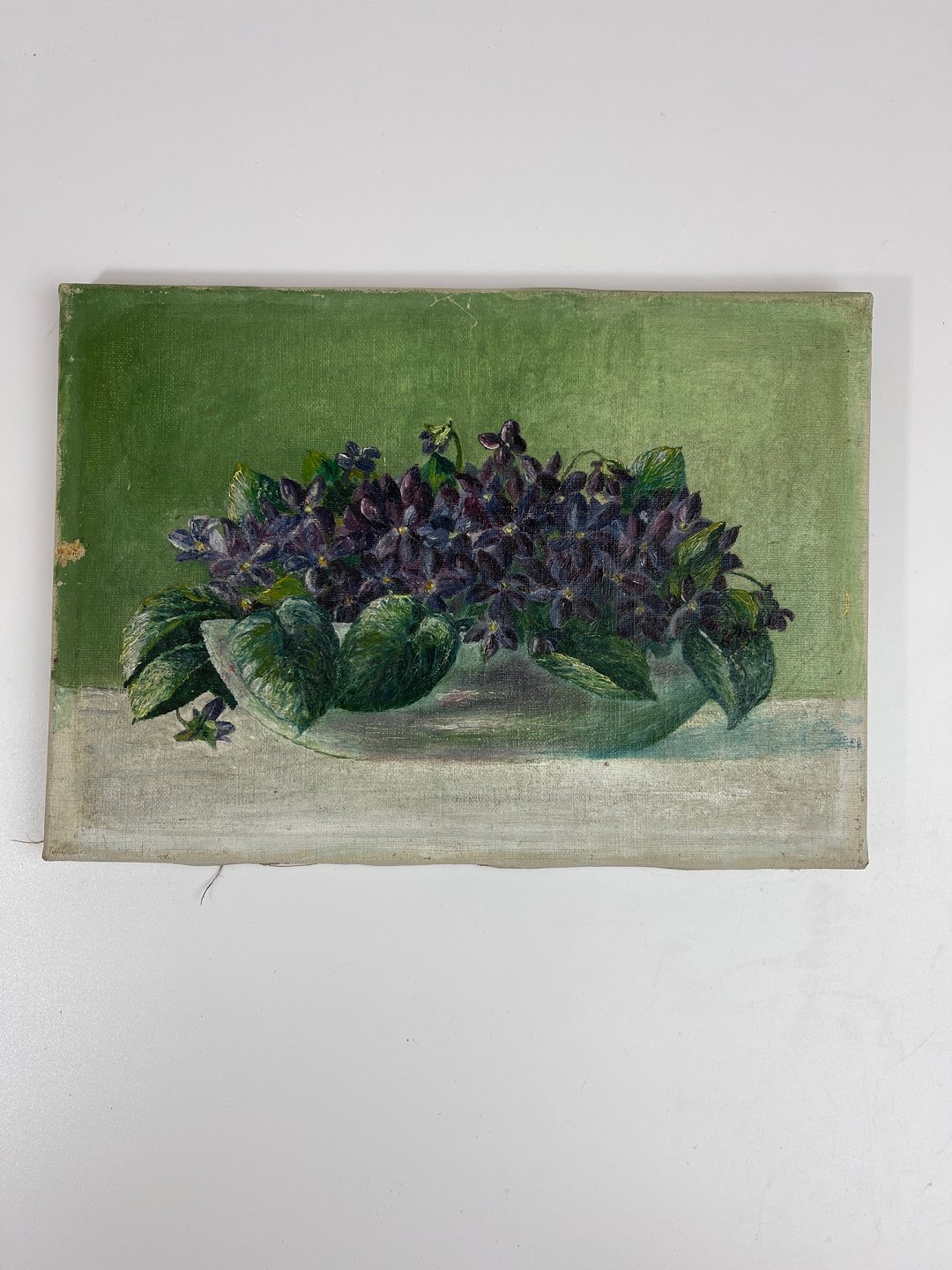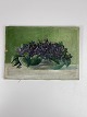 Blomstermaleri af lilla violer arrangeret i en skål på et bord med grøn baggrund. Maleriet har masser af patina og er usigneret.