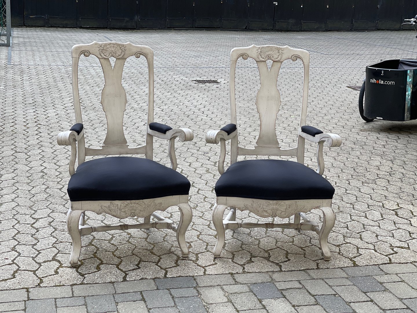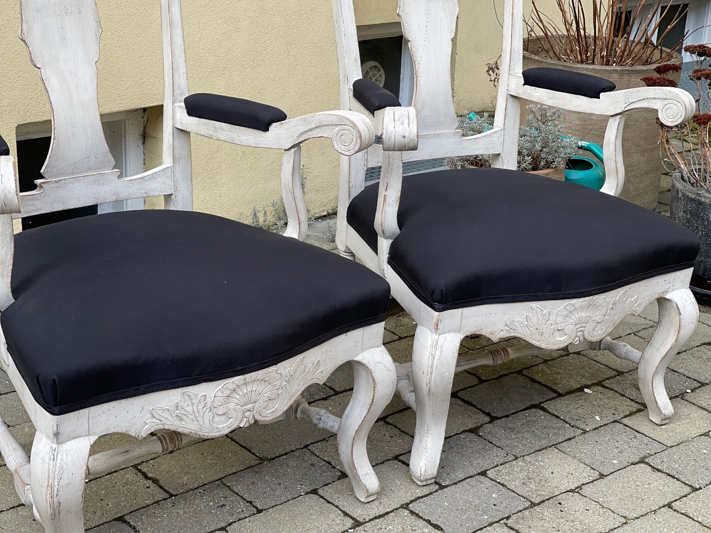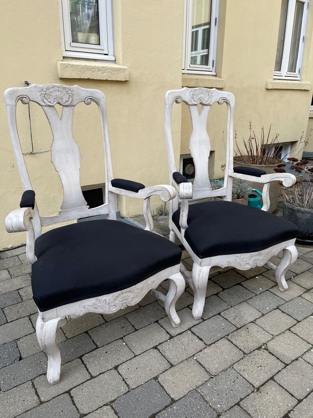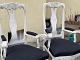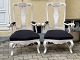 Par svenske rococo- / barok-stil stole fra begyndelsen af 20. århundrede. Hvidmalet træ og stolesæder, der er beklædt med sort stof.