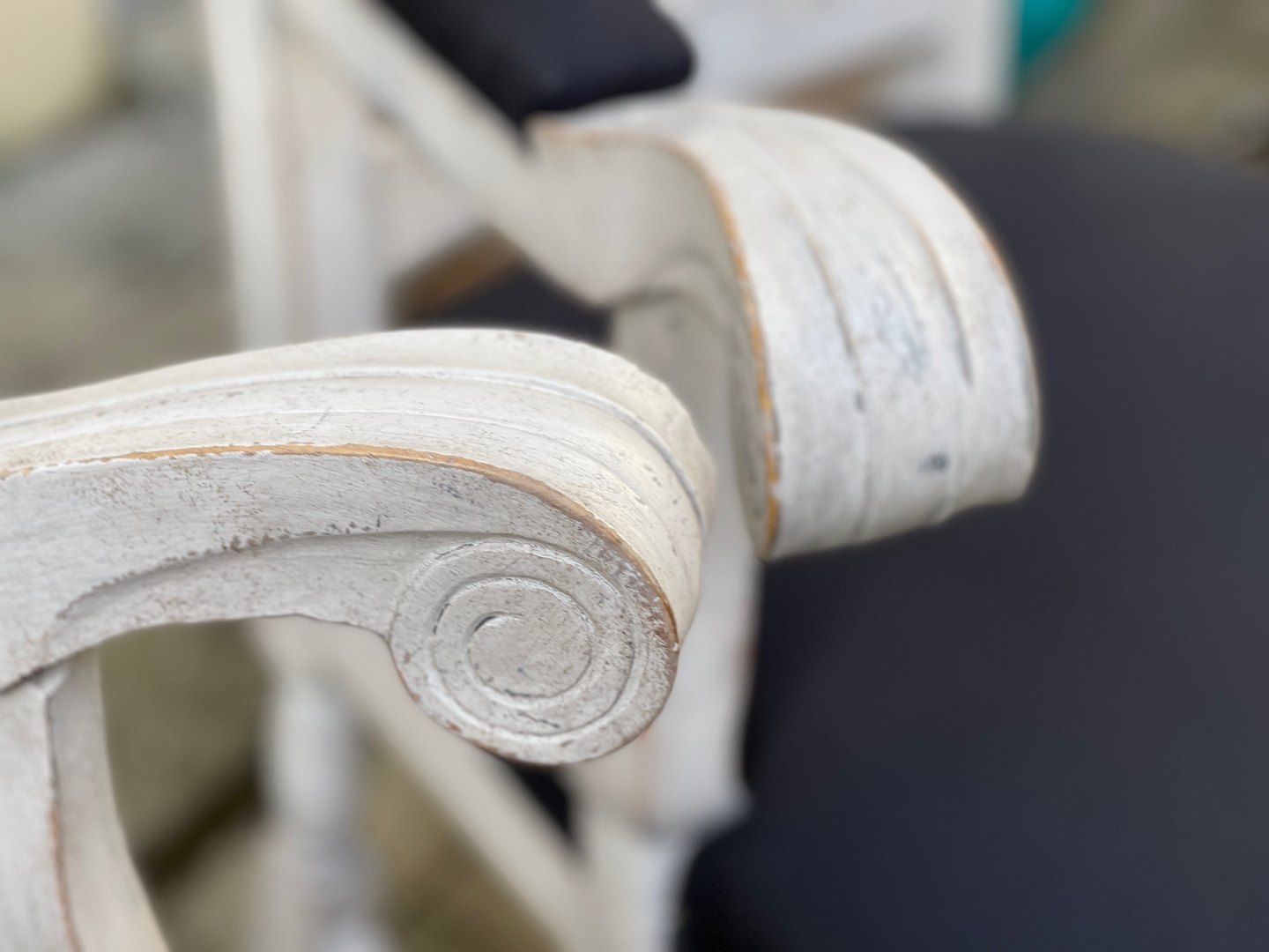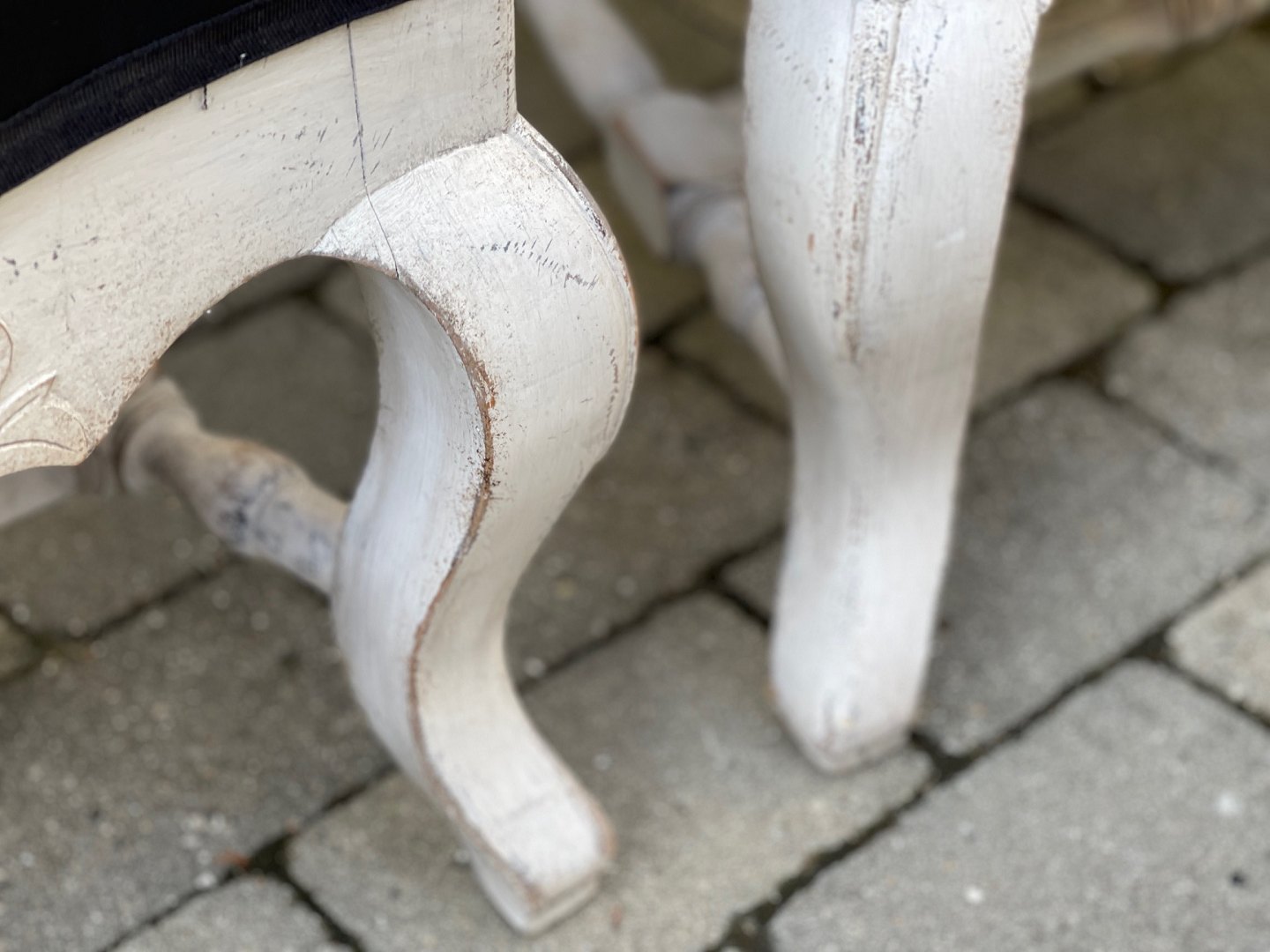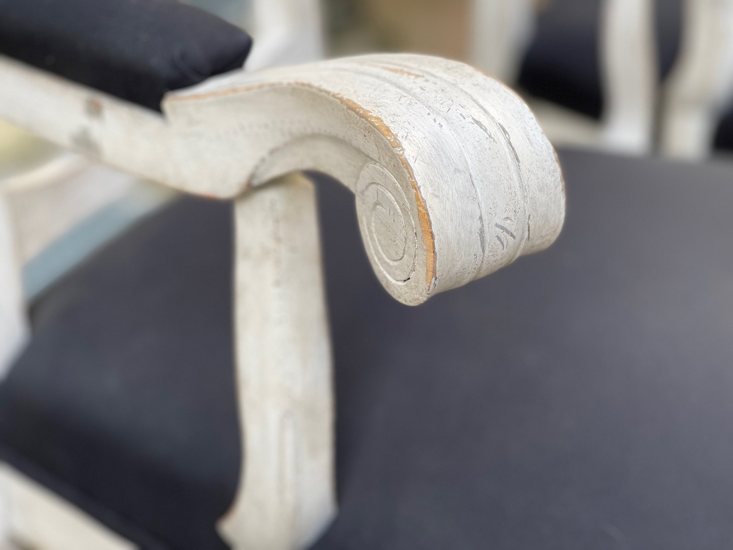 Par svenske rococo- / barok-stil stole fra begyndelsen af 20. århundrede. Hvidmalet træ og stolesæder, der er beklædt med sort stof.