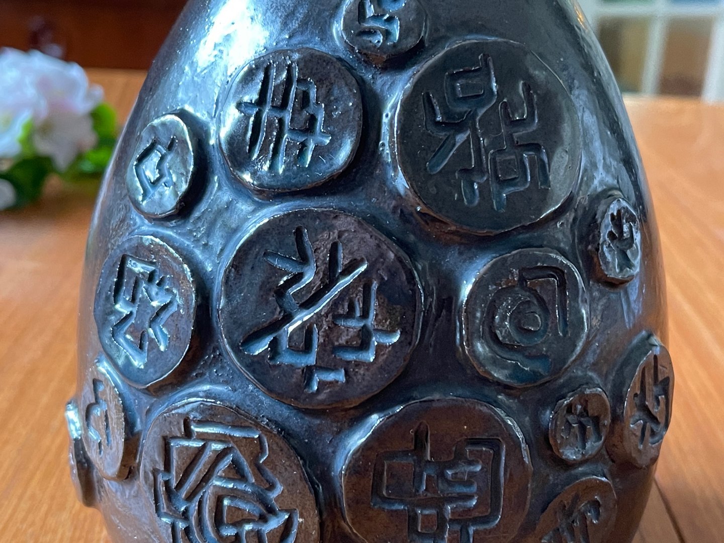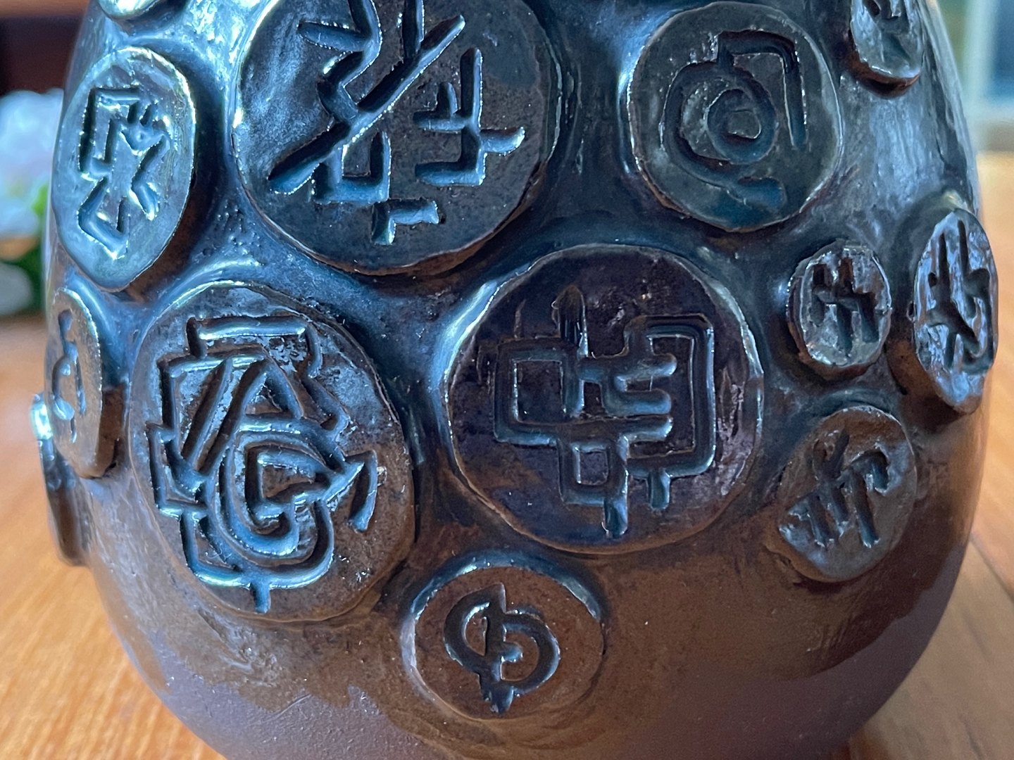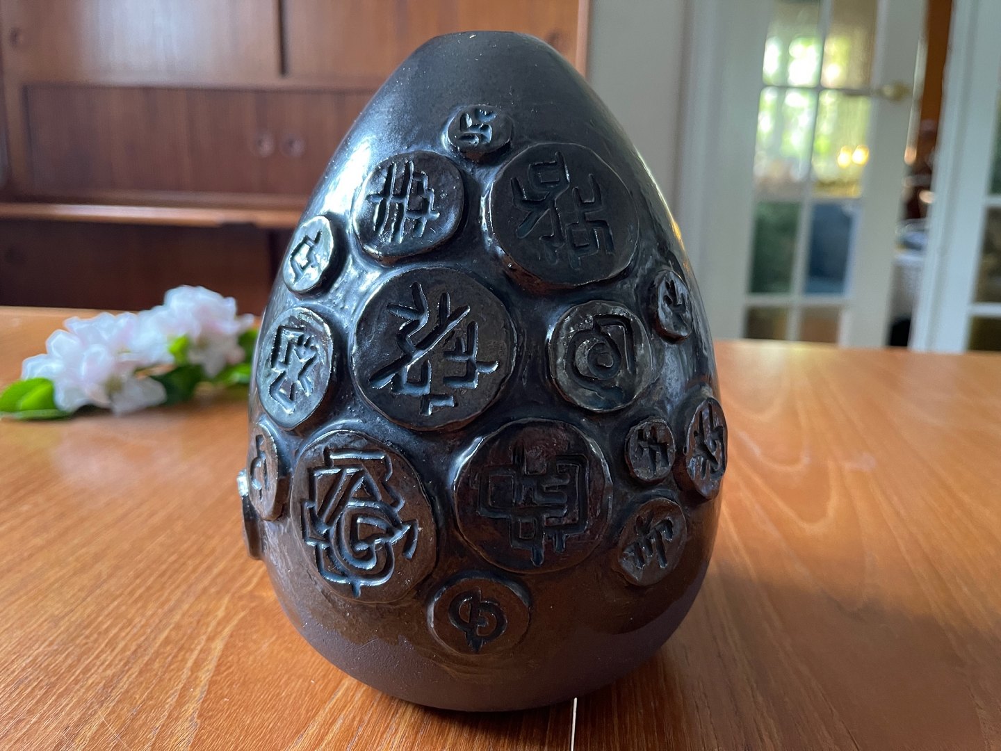 Keramikvase af den bornholmske maler og keramiker Hans Helving. Vasen har en klassisk form og er dekoreret med "medaljoner" eller "segl" i relief. Hvert segl er dekoreret med symboler, og vasen er signeret HH i et af seglene. Den er også signeret i bunden og dateret "65". Det meste af vasen er brunglaseret med blåligt skær i indridsninger i seglene.