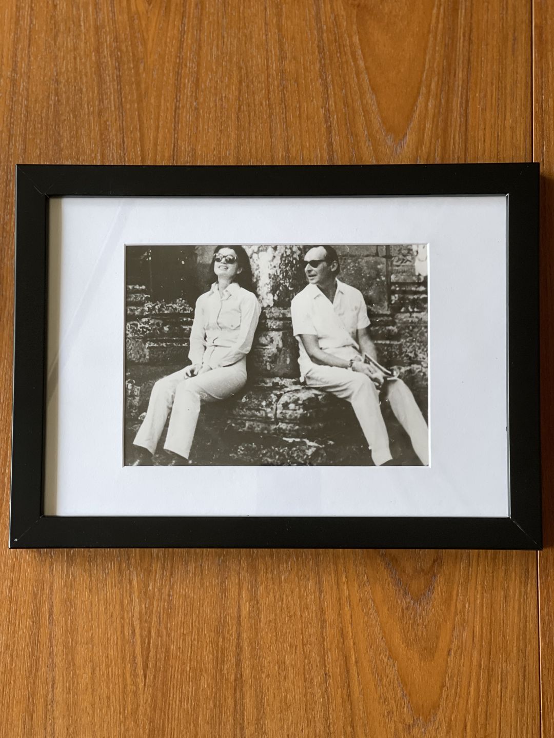 Das Foto zeigt Jackie Kennedy und den britischen Lord Harlech, die zusammen vor einem Tempel in Kambodscha sitzen.