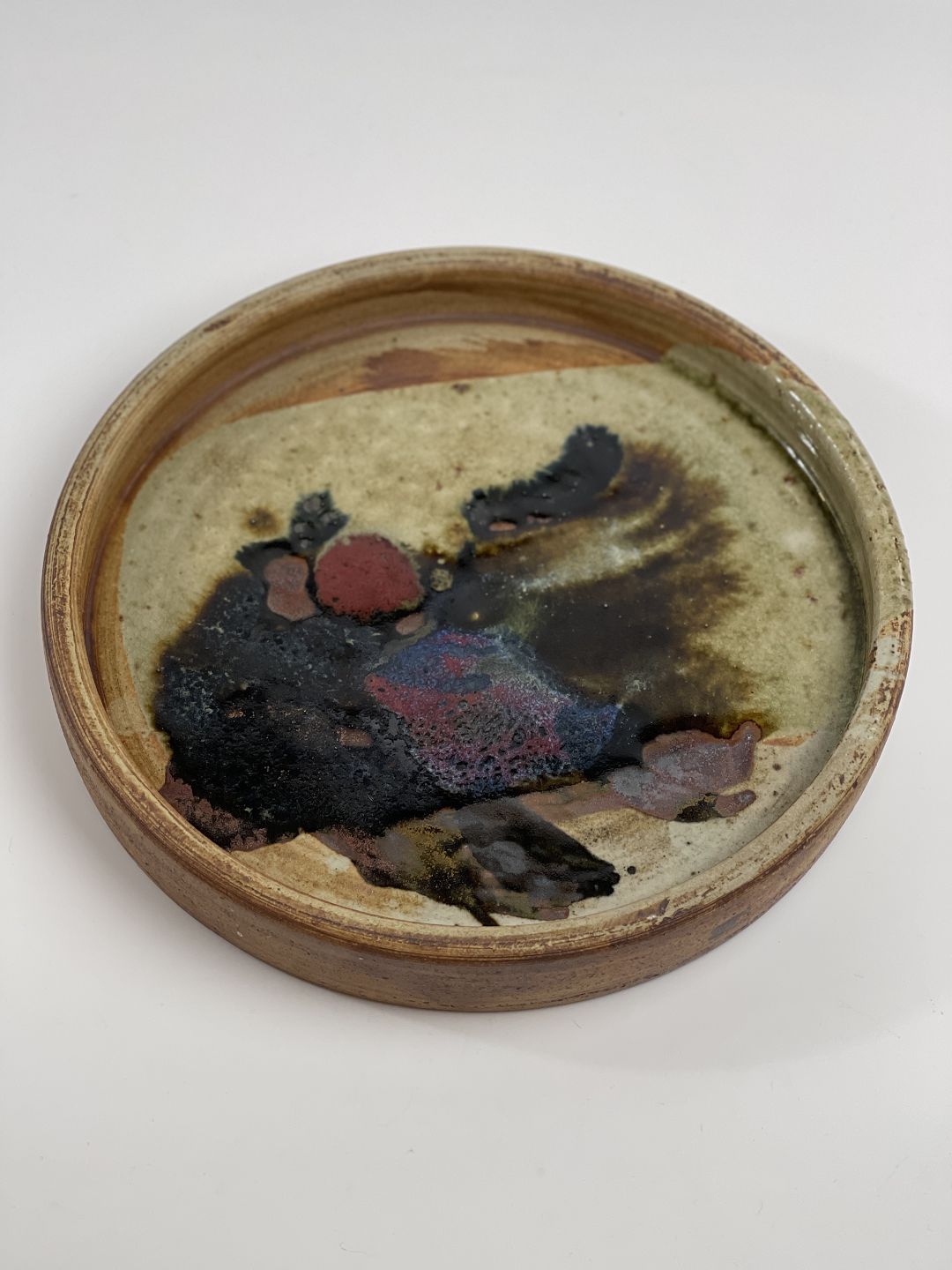 Conni Walther, own workshop. Large dish with multicolored glaze. 20th Century.