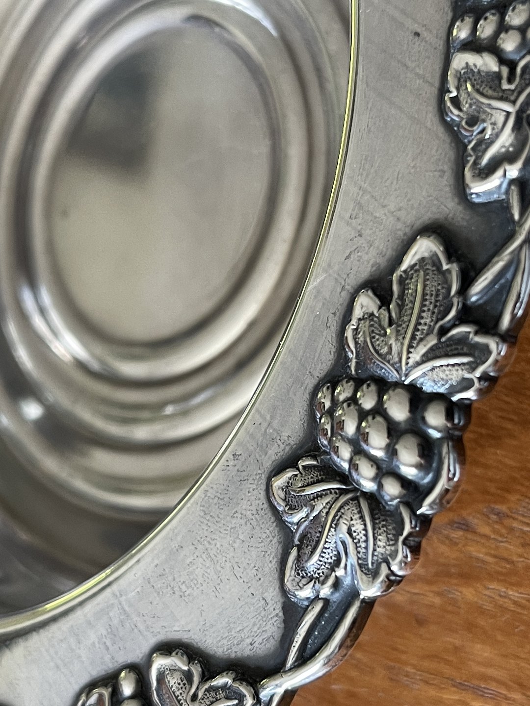 Dansk flaskebakke / vin coaster fra SCF i pletsølv. Dekoreret med vinklaser og blade langs kant. Kan bruges til vin eller champagne.
