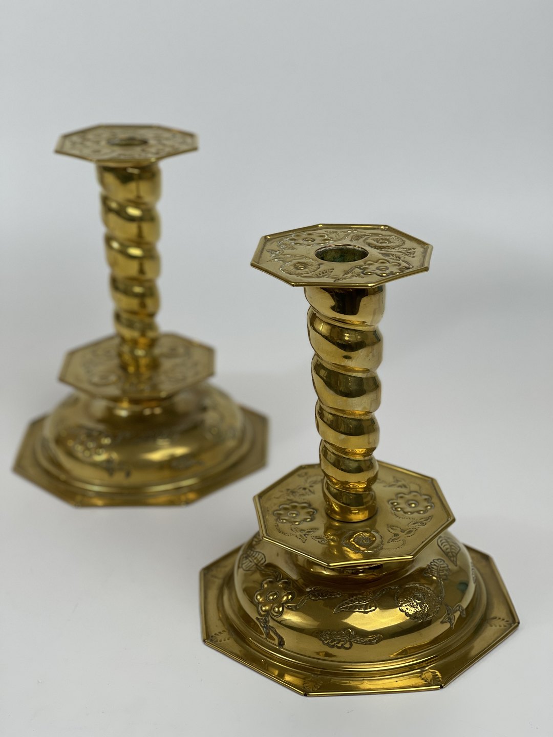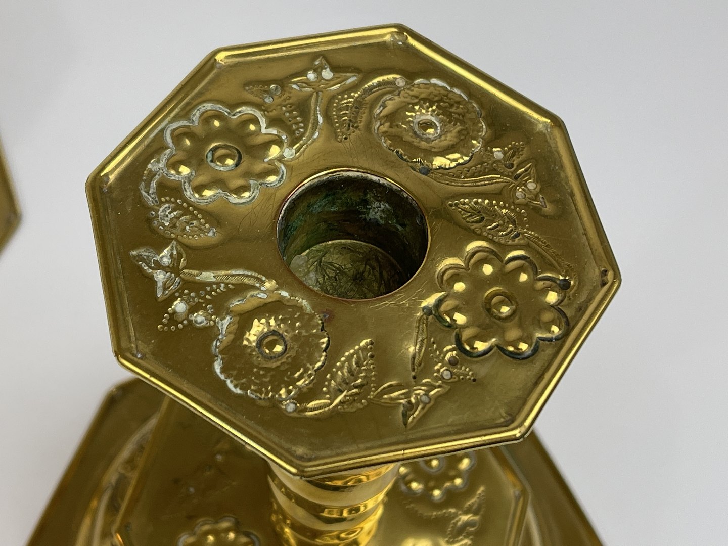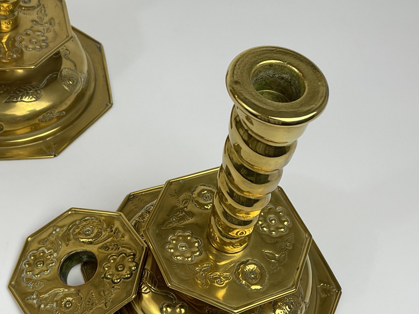 Par superflotte lysestager i udstancet (repousse-teknik) messing (messing-blik). Barok-form, 20. århundrede. Flot kvalitet. Blomster- og bladranker.