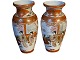Par japanske Kutani-vaser dekoreret i paneler af orange og guld med motiver af havescener med kvinder i kimono samt blomster på den modsatte side. Sommerfugle og kirsebærtræer. Signeret.