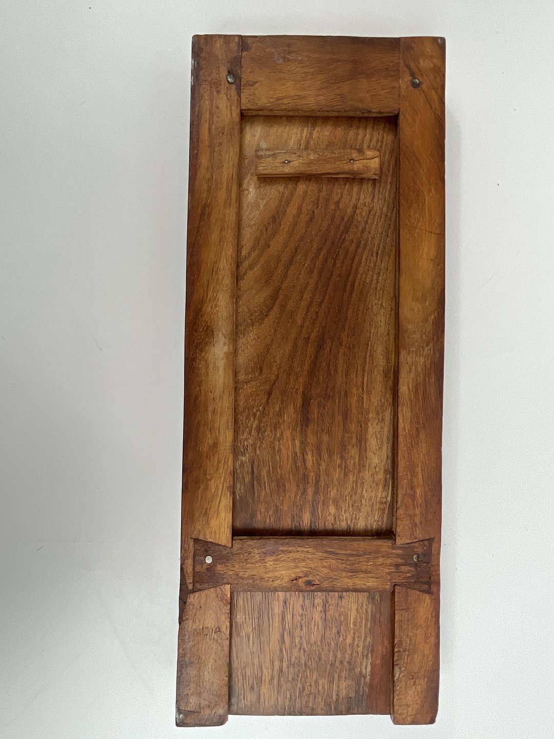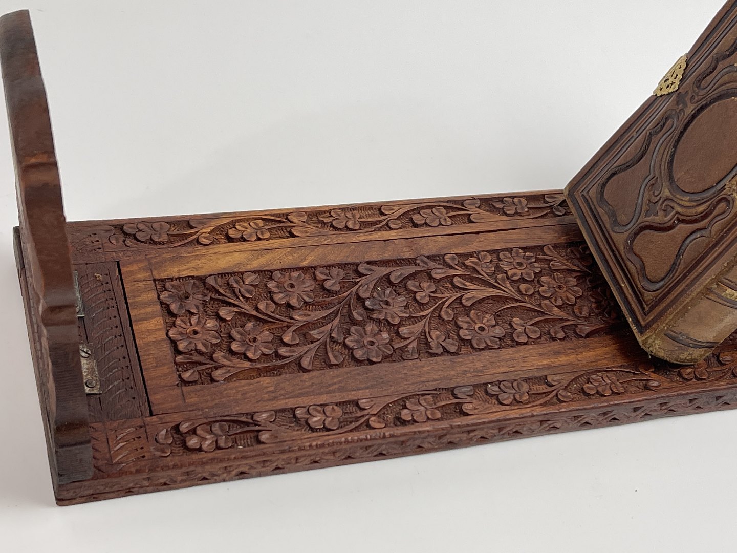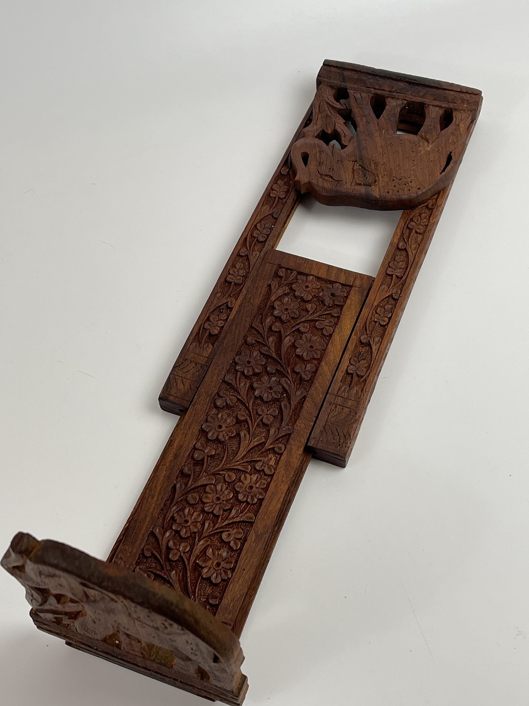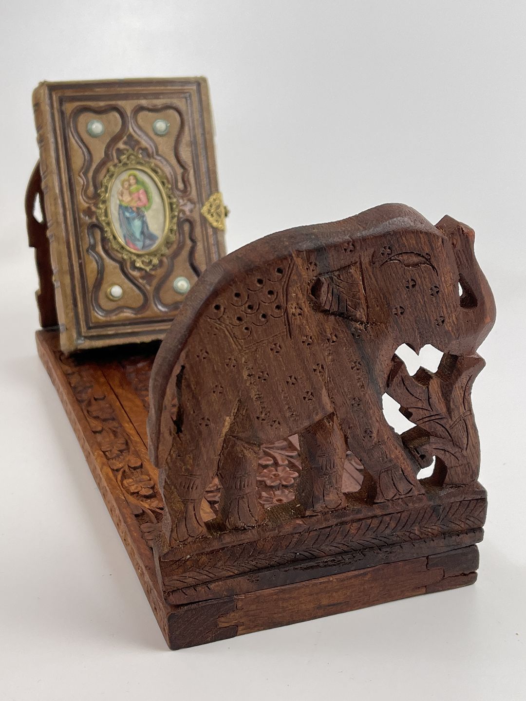 Vintage bogreol af træ med udskårne elefanter og blomster til at stille på bordet. Reolen kan trækkes ud. 20. århundrede. Indisk.