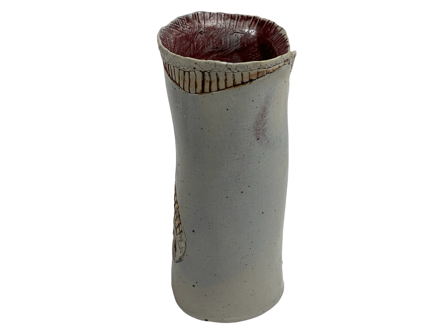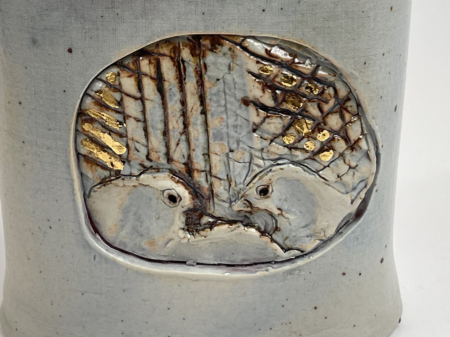Smuk vase af keramik med motiv af fugle i rede. Signeret med monogram GØ for Gerda Østergaard. Eget værksted. Etiketmærket: Dansk Kunsthåndværk. Farverne veksler mellem grå, beige rosa / pink samt guld.