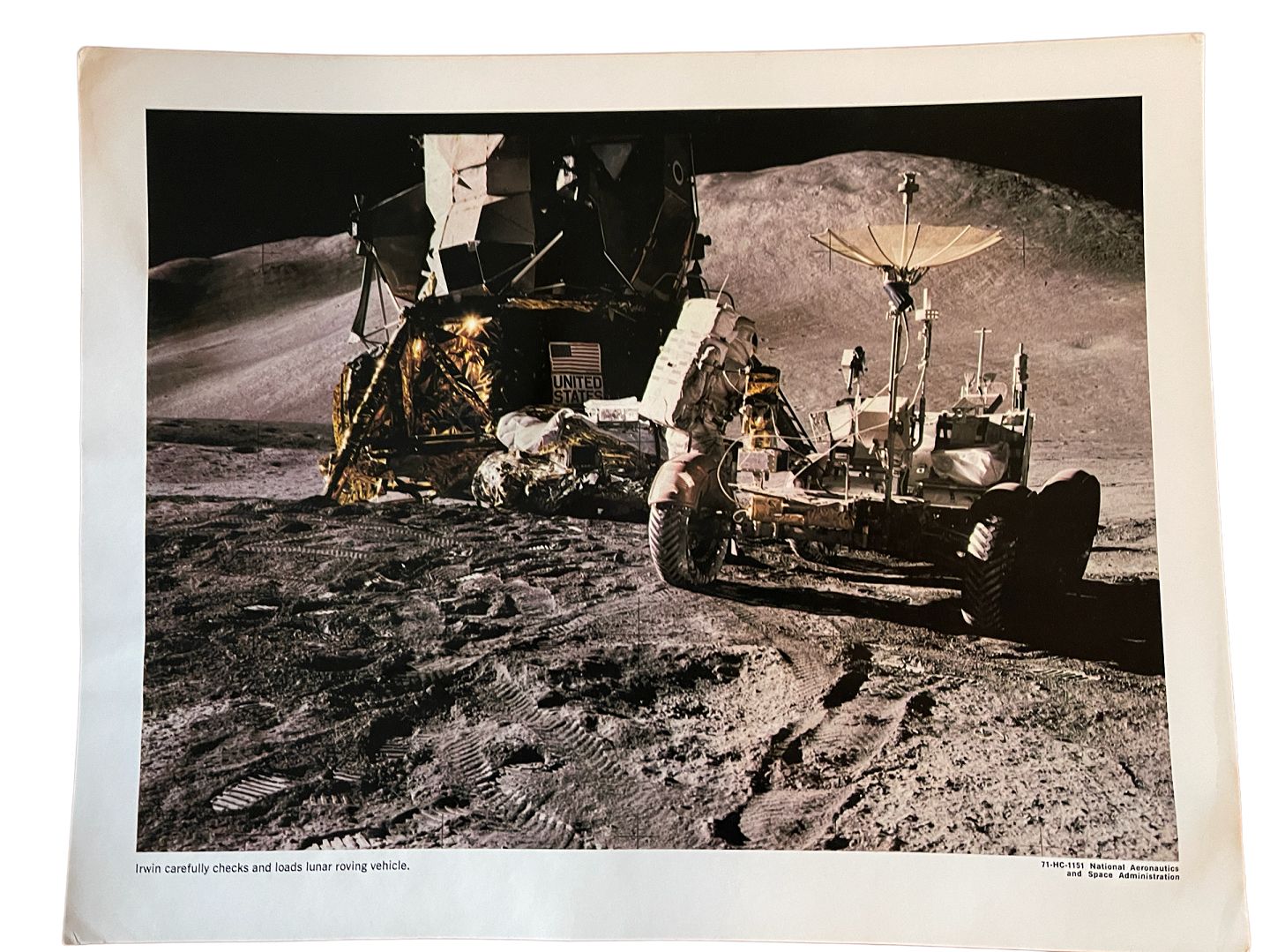 Originalt NASA farveoffsetfotografi fra Apollo 15 månelandingen i juli-august 1971. Astronaut James Irwing er i gang med at tjekke og laste månekøretøjet nærheden af månelandingsmodulet Falcon. Apollo 15 var den 4. gang mennesker var på månen, og denne gang var der større fokus på at indsamle materialer. Derfor medbragte astronauterne for første gang et køretøj, the Lunar Roving Vehicle (LRV). Køretøjet blev efterladt på månen, hvor det stadig står.