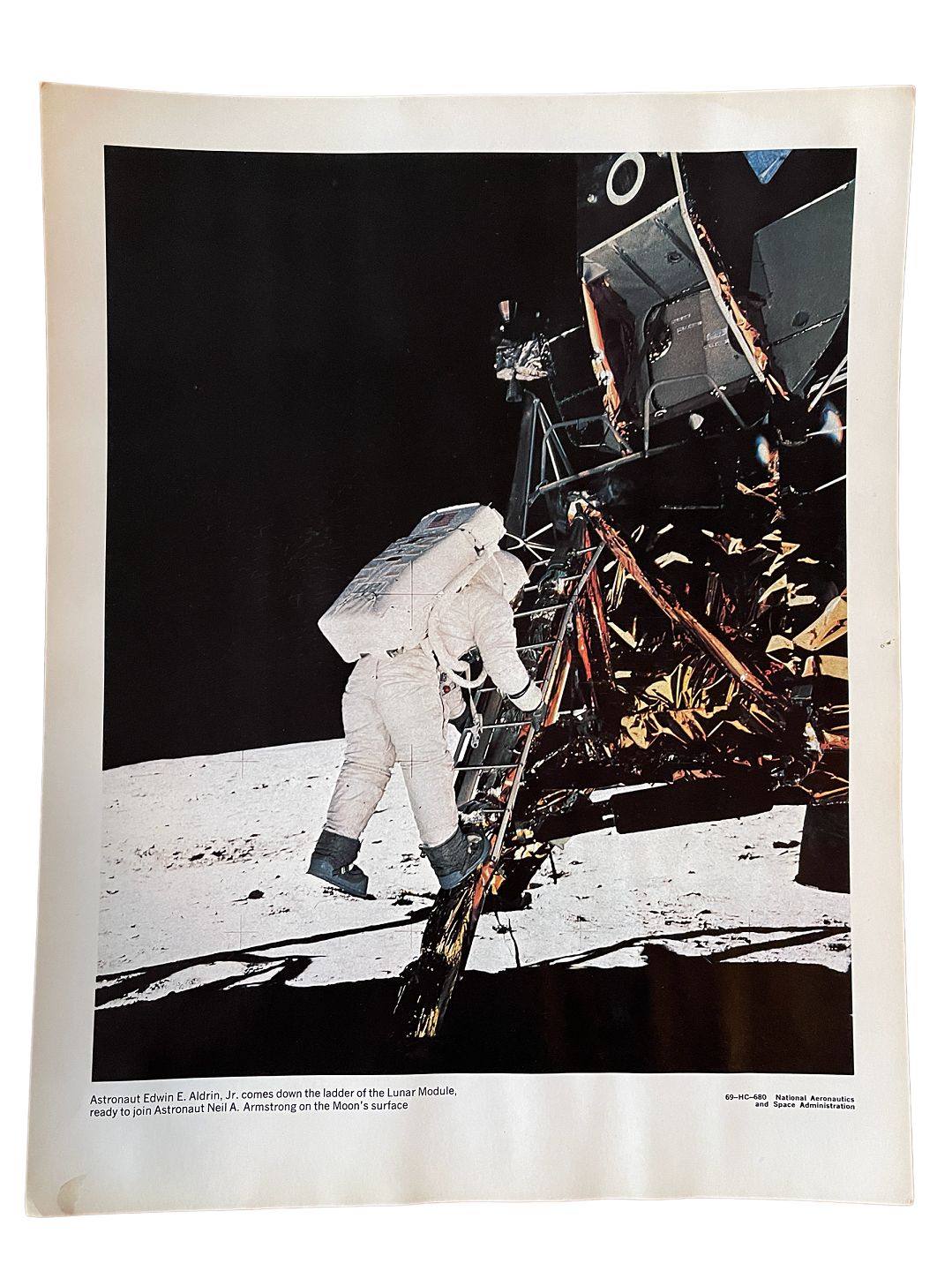Originalt NASA farveoffsetfotografi fra Apollo 11-månemissionen af astronaut Edwin Aldrin, der er på vej ned ad stigen fra landingsmodulet Eagle for at sætte fod på månen. Han blev det andet menneske til at gøre netop det, for før ham trådte Neil Armstrong ud på månen som det første menneske.