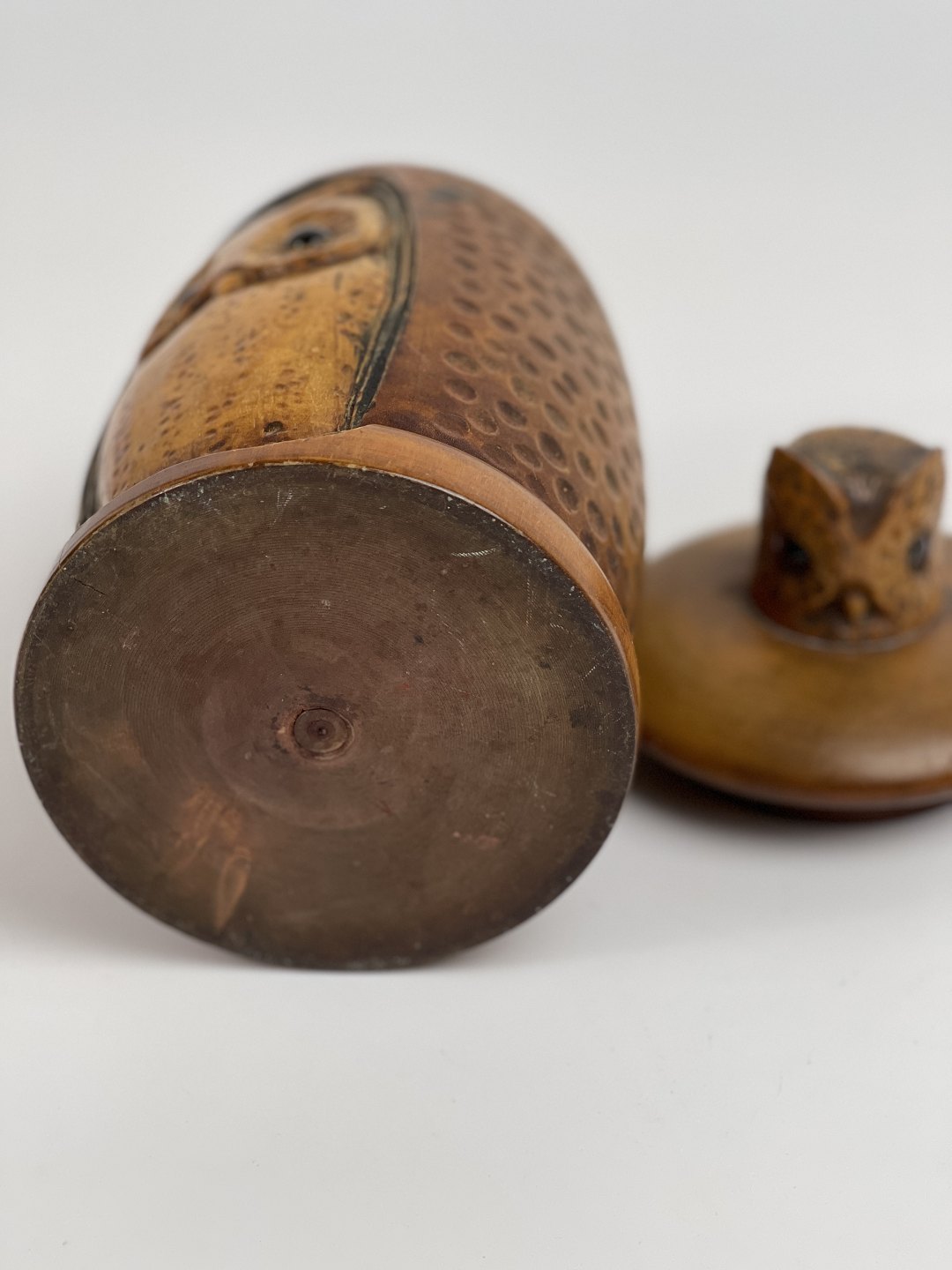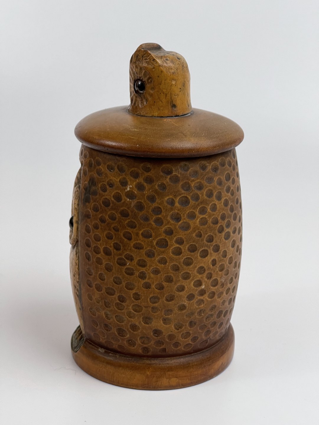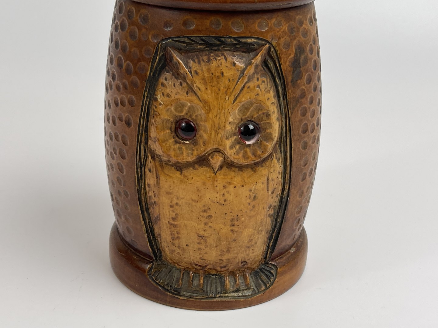 Håndlavet tobakskrukke / lågkrukke i træ med udskåret ugle i relief. Mindre uglehoved er udskåret og påsat som håndtag til låget. Begge ugler har glasøjne. 1 halvdel af det 20. århundrede.