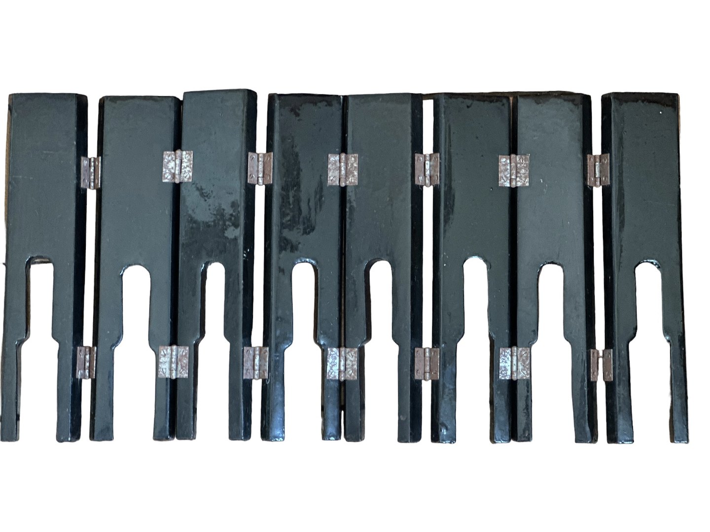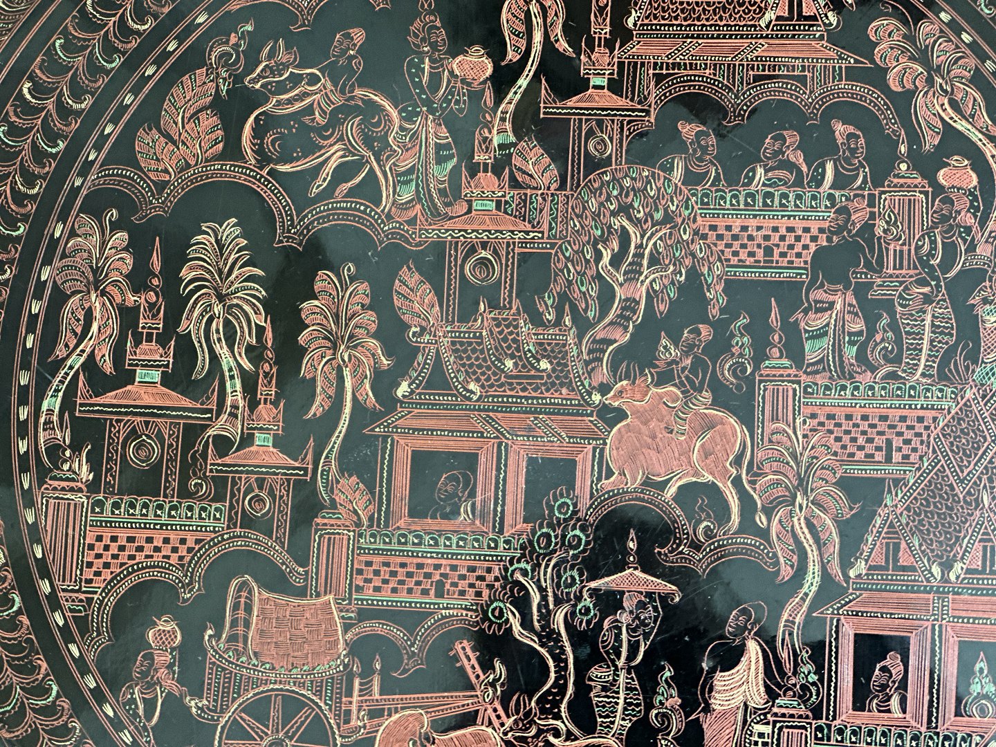 Small octagonal Burmese tea table / Chai Table (Myanmar). Lacquer work. The table's frame is foldable and the top can be removed. Scenes from urban life in Burma with people, palm trees, livestock, houses, temples, etc.