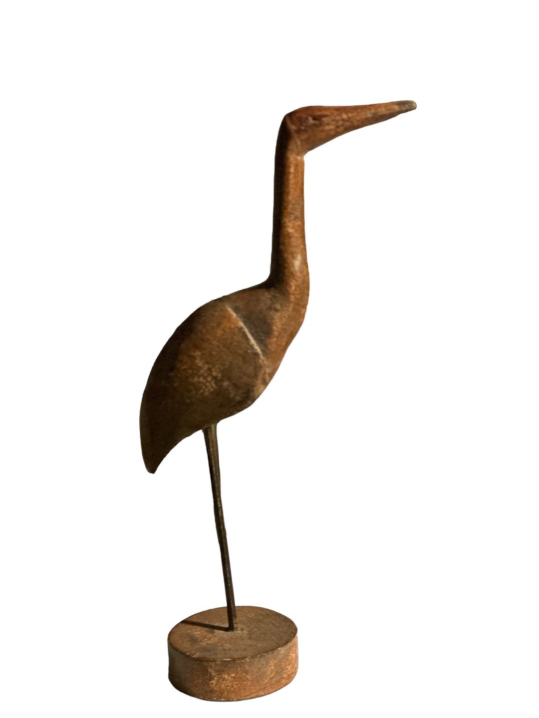Sculptural and decorative bird / decoy carved from wood and standing on a wooden stand.