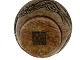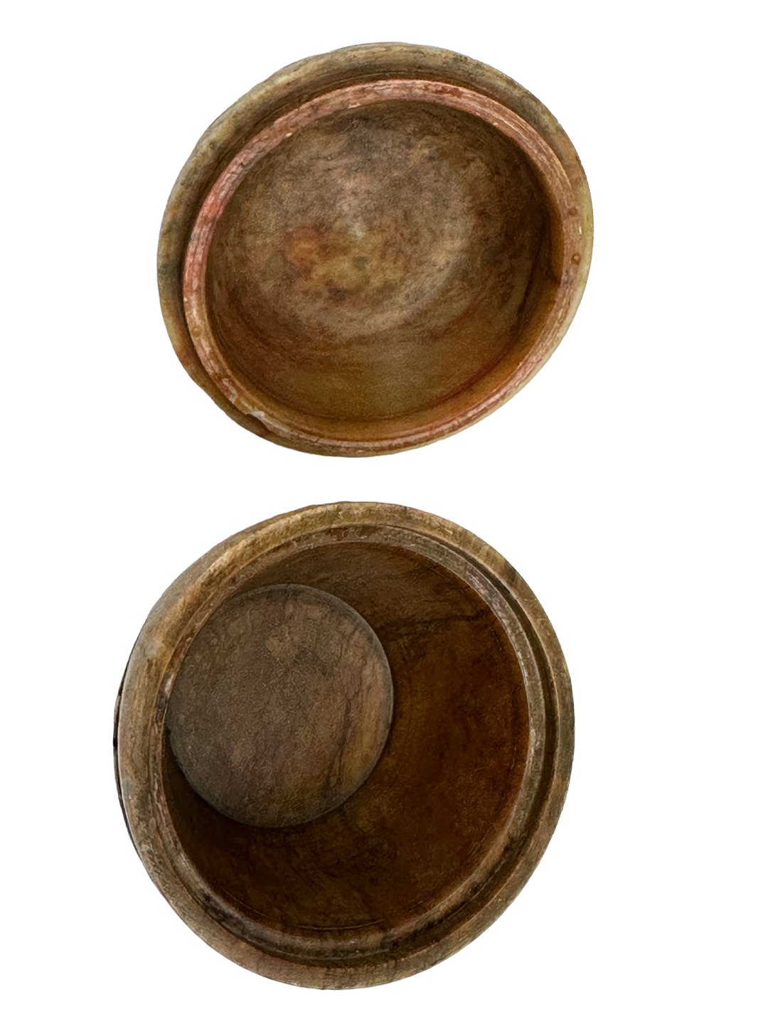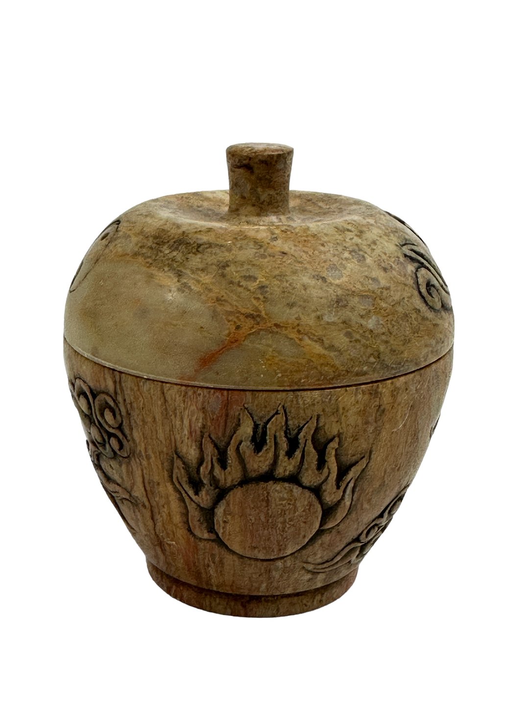 Kinesisk miniature krukke med låg med drage, flammende sol, skriftstegn samt Yin og Yang tegn udskåret i sæbesten. Signeret. 20. århundrede.