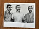 NASA: Small original black and white photograph of the three Apollo 11 astronauts Neil Armstrong, Mike Collins and Edwin Aldrin, gelatin silver, July 1969 with the Apollo V rocket in the background.