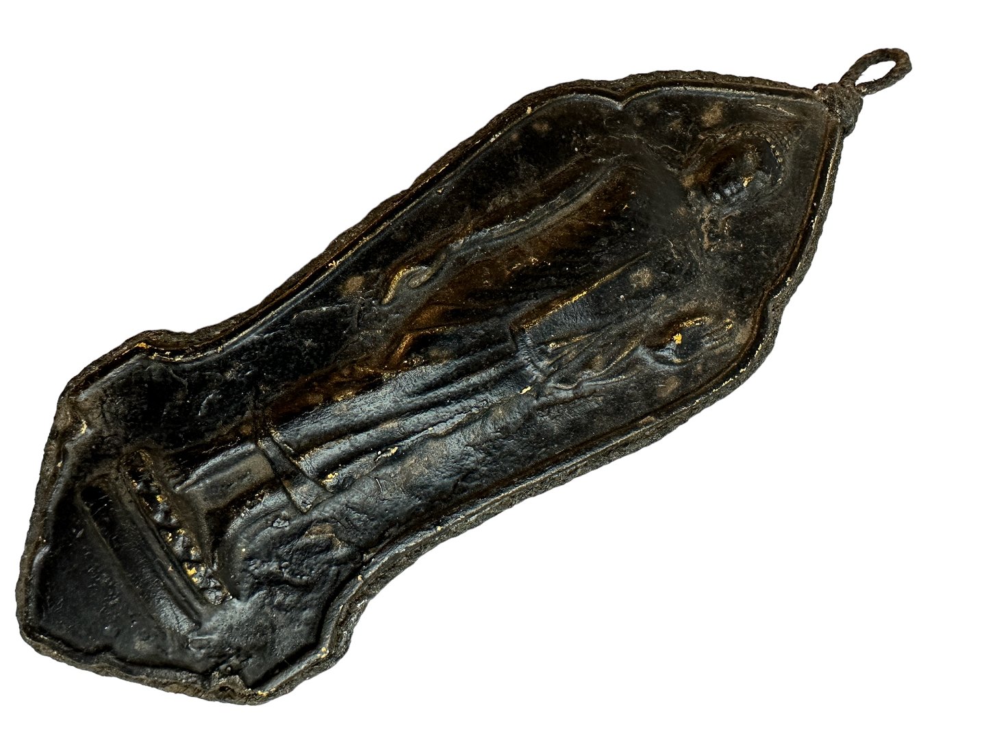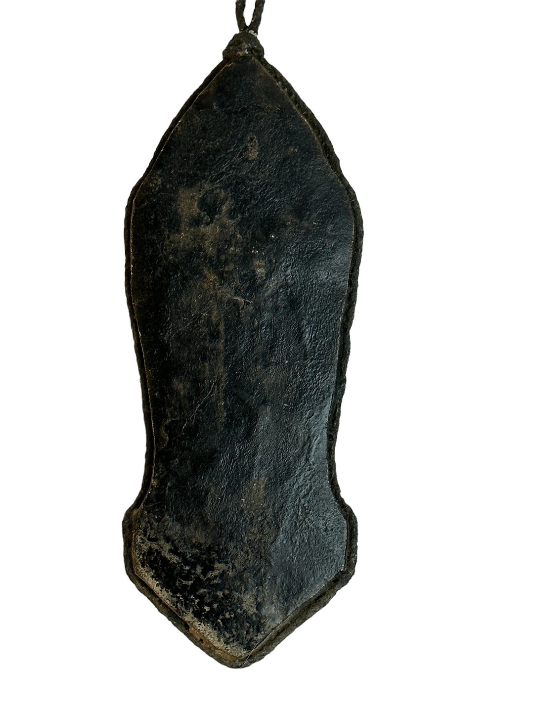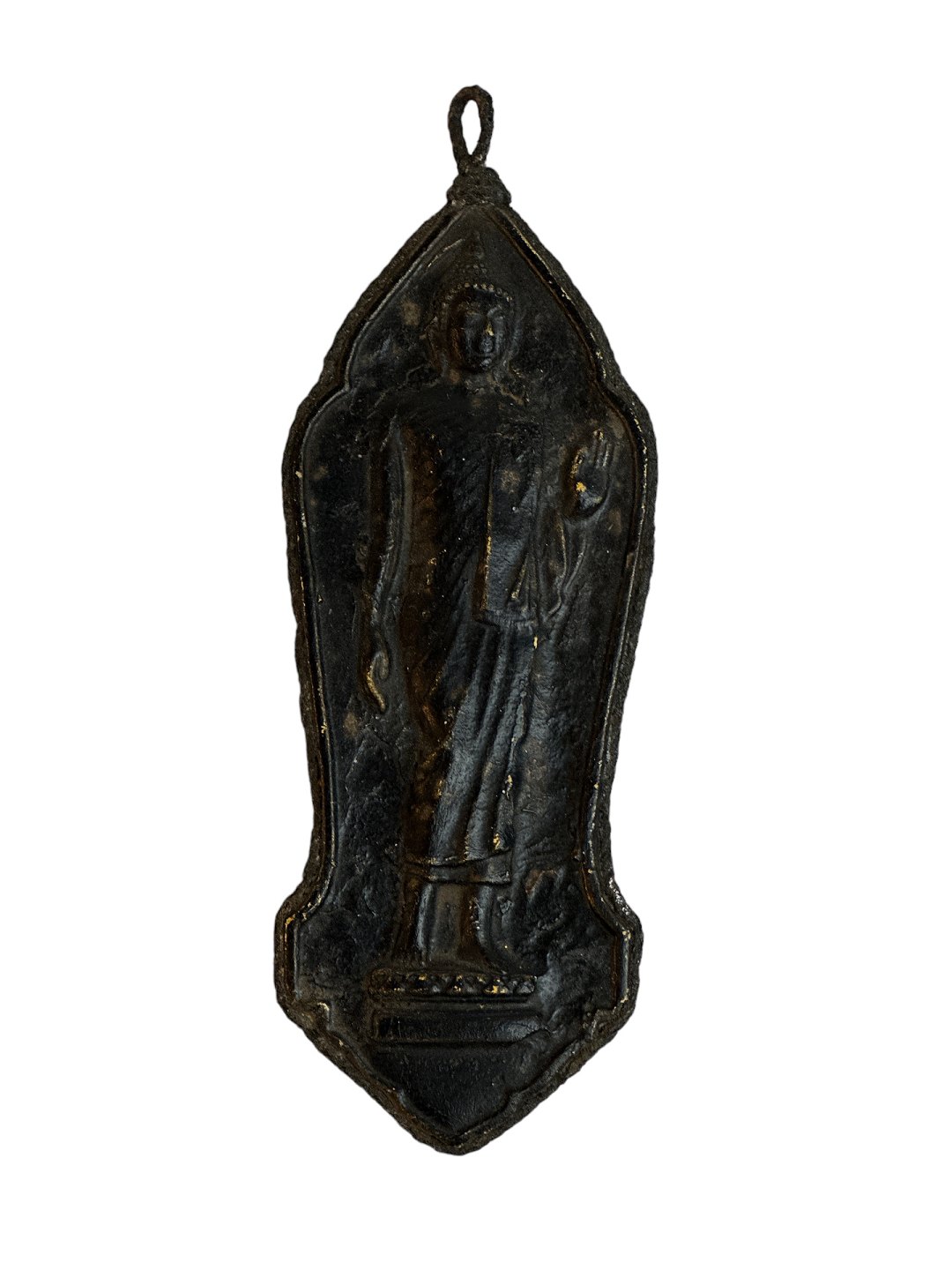 Håndlavet, gammelt Buddha-ophæng, husalterfigur/amulet lavet af læder/træ, lak og snor med motiv af gående Buddha. Phra Leela (Walking Buddha). Antageligt Thailand.