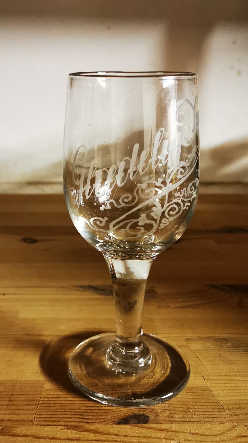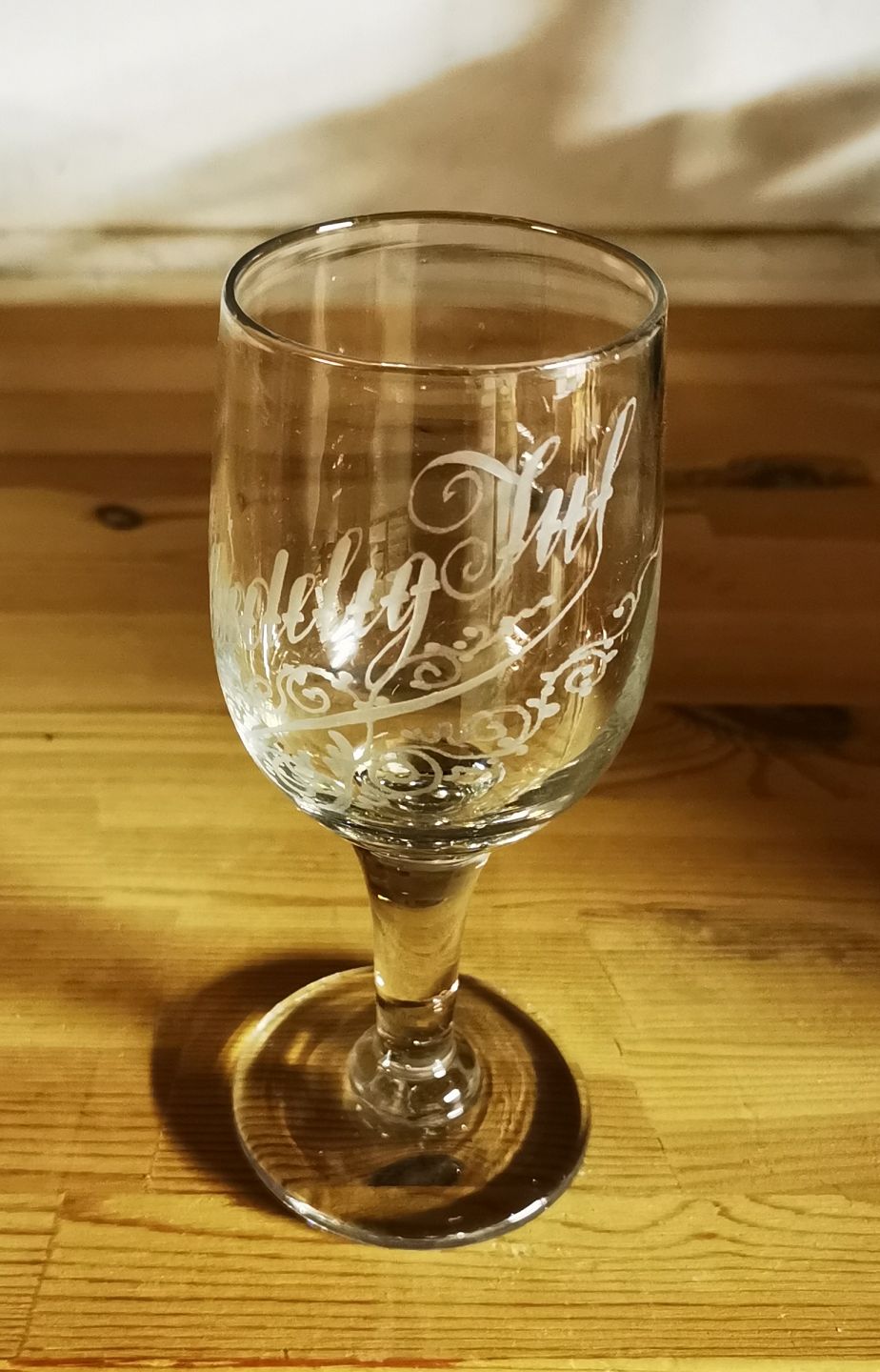 "Glædelig Jul" på Don Carlos vinglas fra Aalborg Glasværk