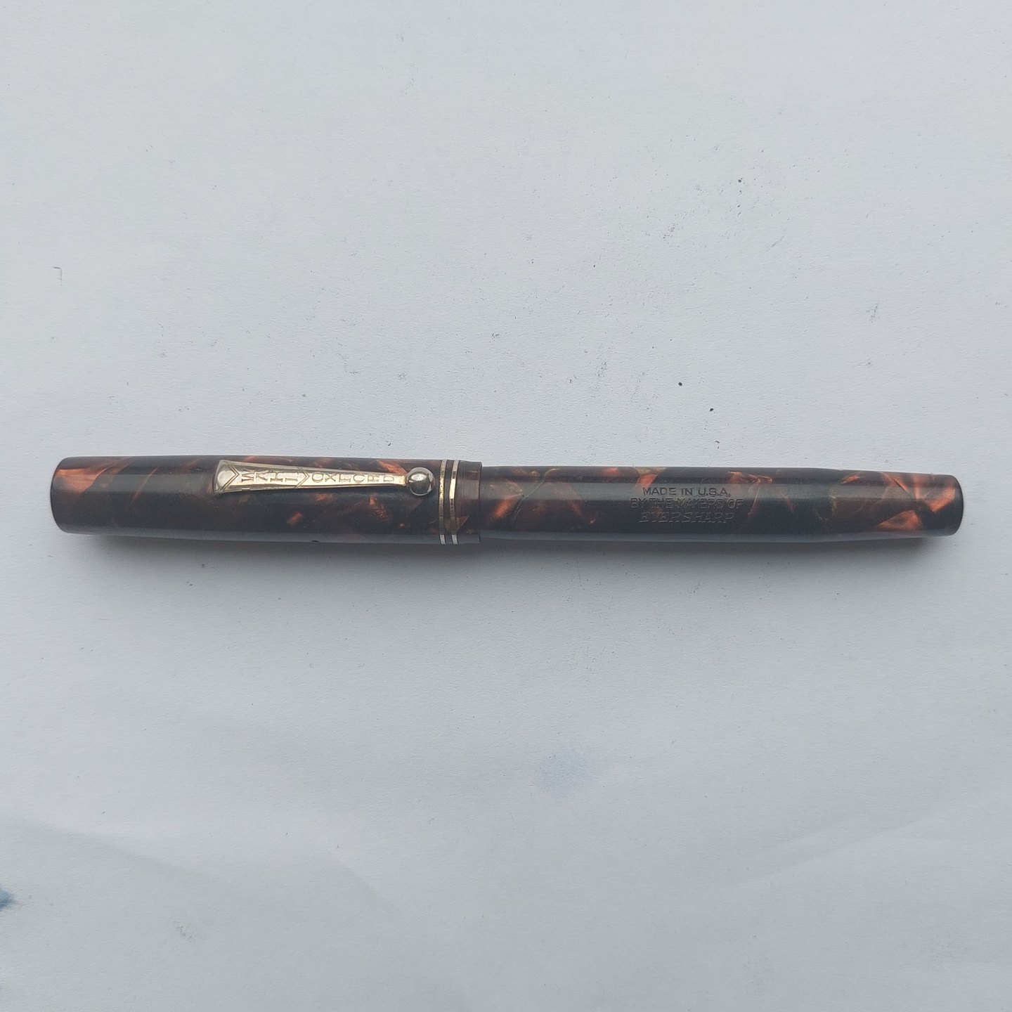 Eversharp product: Marbled Wahl Oxford fountain pen with liver filler. Appears in good condition. Text on the body: Made in U.S.A by the maker of EVERSHARP. No damage or repairs. 14 karat gold nib made in U.S.A. Does not work. A new rubber set must be inserted before the fountain pen writes again.