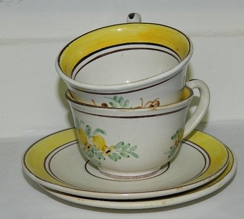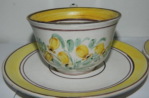 Sjælden kaffekop og underkop fra Lars Syberg lervarefabrik. Dekoreret med blomster. Begge kopper har et par små overfladeskår i glasuren.
