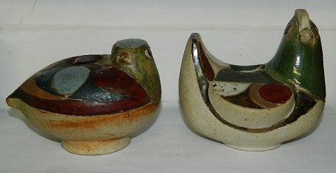 Due og høne i keramik af Julie Høm. Begge figurer fremstår i perfekt stand. Duen er 9 1/2 cm høj og 141/2 cm lang. Hønen er 13 cm høj og 14 cm lang. Kunstnersignatur JH på bunden.