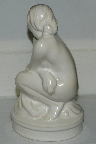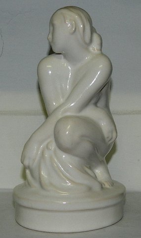 Figur af nøgen kvinde i keramik fra Peter Ipsens Enke. Dækket af hvid glasur. I perfekt stand. Utydeligt faberiksmærke på bunden PIE og krone. Ligeledes utydelig kunstnersignatur på soklens bagside F.C. 21 cm høj.
