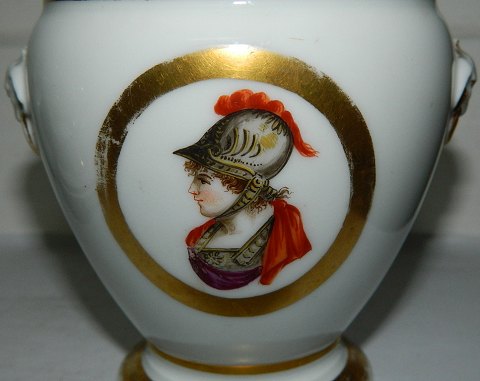 Blomsterskjuler fra Meissen ca. 1840. Dekoreret med samme portræt i cirkel på to sider. Par hoveder i porcelæn som dekoration på to andre sider. Fremstår i god stand med brugsslid på guldet. Fabriksmærket på bunden. 11½ cm høj.