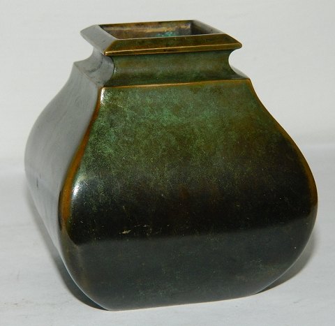 Tung Art Deco vase i bronce af Ib Just Andersen (1884-1943). Fremstår i god stand uden skader. Flot både grøn og brun bronceret overflade. Mærket med modelnummer B 158 logo DENMARK. 8½ cm høj.