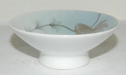 Skål i porcelæn på fod med dekoration af fisk. Fremstillet hos Bing & Grøndahl, Danmark, ca. 1920. I perfekt stand. Signeret af kunstneret med EB. 1. sortering. 4 cm høj og 9 cm i diameter.