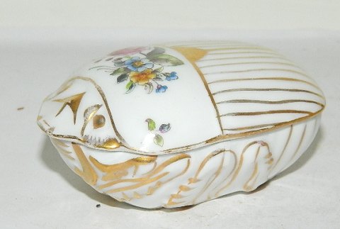 Skål i form af skarabæ fra Royal Copenhagen. Bemalet med blomster i overglasur. Fremstillet omkring 1880. Skår på indersiden af låget og skår på indersiden af skålen. Fabriksmærket på låg og under skålen. 4 cm høj og 8 cm lang.