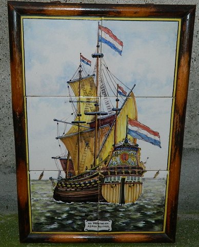 Bemalede kakler med motiv af hollandsk sejlskib fra 1700-tallet. I god stand. Formoder dette skibsbilled er malet omkring 1940.