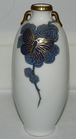 Vase i porcelæn med to ører. Dekoreret i blåt og guld med blomst og sommerfugl. Fremstillet mellem 1900-1923. Signeret af kunstneren Else Hasselriis på bunden. 19 cm høj.
