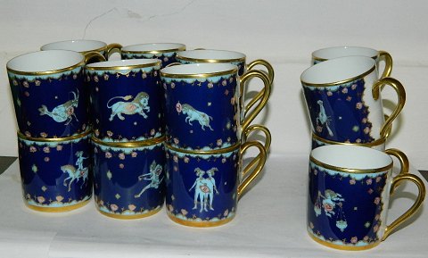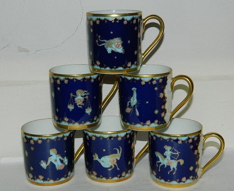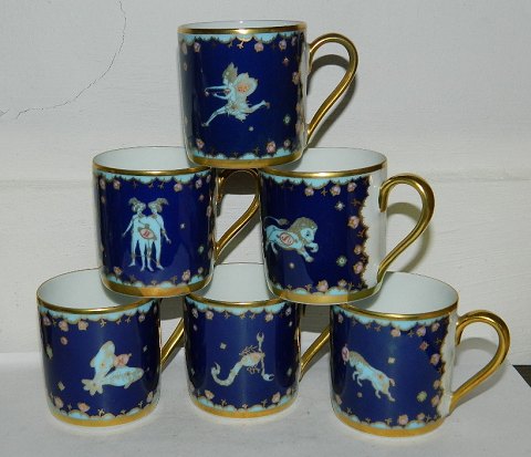 17 kopper og 6 underkopper i porcelæn med Stjernetegns-motiv. Designet af Ole Winther for Hutschenreuther. Et sæt i form af kop og underkop koster d.kr. 150,00. Kopperne koster d.kr. 75,00 enkeltvis. Alle i perfekt stand. 6 cm høje.