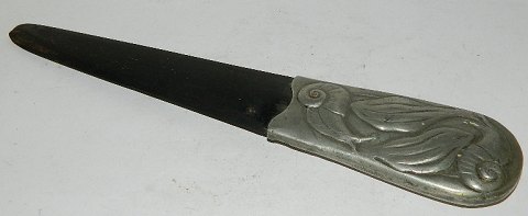 Hertz / Ballin: Brev kniv i træ med skaft i tin dekoret med snegle. Træ og metal bærer præg af brugsslid. Tinskaftet med utydeligt fabriks stempel. 24 cm lang.