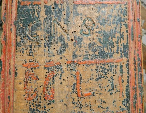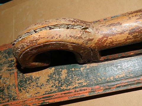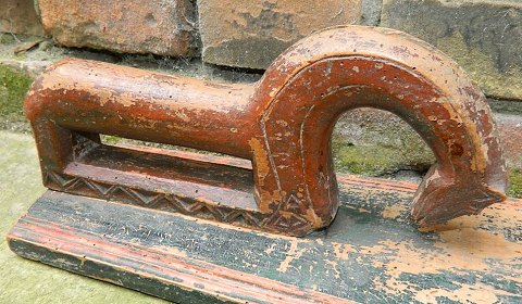Bemalet manglebrædt i træ med hest som greb. Stærkt brugsslid. Indridset initialer CNS samt bemalet årstal 1793. Hestens manke og hale mangler ! 51½ cm langt.