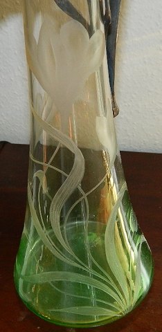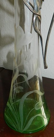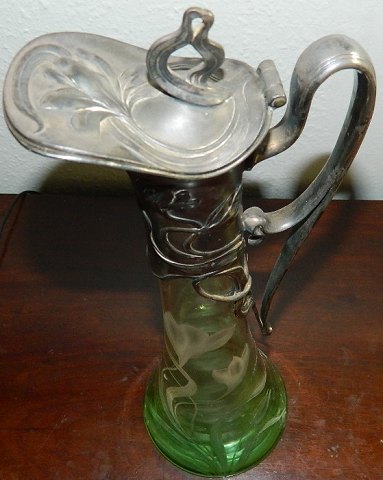 Tysk WMF (Württembergische Metallwarenfabrik AG) kande i glas med metalmontering i jugend-stil. Kanden overvejende grøn i bunden. Blomsterslibning rundt om kanden. Både glas kanden og metalarbejde i god stand. Produktionsår stemplet indenvendigt i låget "1903". Hanken fabriksstemplet. 41½ høj LIGNENDE KØBES