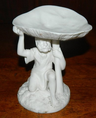 Figure in biscuit of gnom from Gustavsberg, Sweden. Made around 1900. The gnom is sitting under a mushroom - function as a bowl. Glazed at the bottom. In perfect condition. Factory mark on the bottom. 12 cm (4,75") high