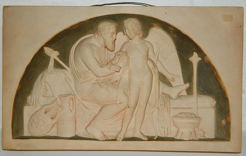 Efter Bertel Thorvaldsen motiv fra Rom 1823: Peter Ipsen, Kjøbenhavn, platte/relief i terracotta fra sidste halvdel af 19. århundrede. Relieffet forestiller Amor, der optages hos Anacreon ("Vinteren"). I god stand uden skader eller reprationer. Fabriksstemplet på bagsiden. Mål: 17½ cm x 29 cm