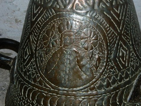 Stor vandbeholder i kobber med to håndtag. Mellemøsten 19. århundrede. Dekoreret med turbanbeklædt mand. Fremstår i god stand. Er ikke vandtæt. Mindre revne ved bundens kant kan reparares. 49½ cm høj, bundens diameter på 36 cm og åbningsdiameter på 17½ cm.
