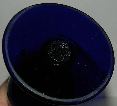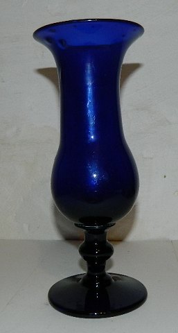 Vase i blåt glas på fod. Muligvis fremstillet på Conradsminde eller Holmegaard Glasværk i midten af 19. århundrede. Fremstår i god stand uden skader eller reparationer.