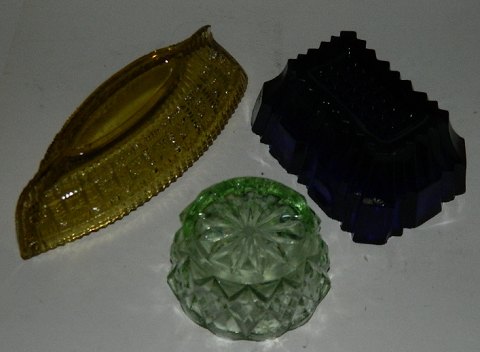 Tre gamle pressede saltkar i farvet glas. Det gul/brune bådformede koster 300,00. Det grønne kr. 225,00. Det blå saltkar er reserveret.