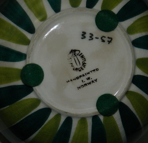 Farverig skål i fajance fra Stavangerflint i Norge designet af Inger Waage. Fremstår i perfekt stand. Fabriksmærket og kunstnerinitialer I.W. på bunden. 9½-10 cm høj og 16 cm i diameter.