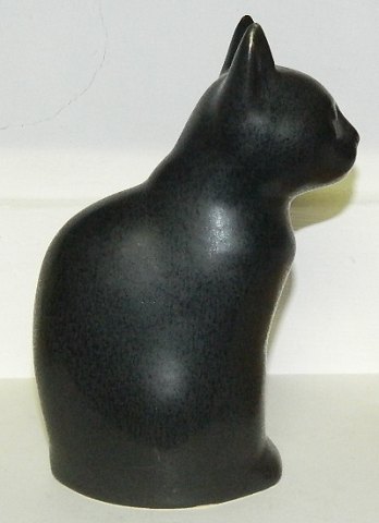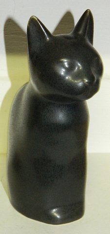 Figur i keramik af siddende kat i keramik. Dækket af en mørk blå glasur. Skabt af Knud Basse (1916-1991), der havde sit værksted på Bornholm. Figuren er i perfekt stand. Signeret af kunstneren på bunden med KB. 19 cm høj.