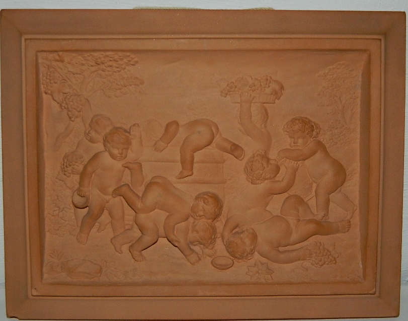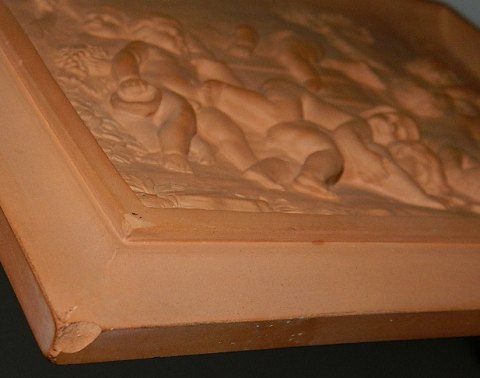 Platte i teracotta fra Peter Ipsen, Kjøbenhavn. Motiv med babyer der plukker og spiser druer. Lille skår på plattens nederste venstre hjørne. Fremstillet omkring 1880. Fabriksmærket på bagsiden. Mål: 14 cm x 18 cm.