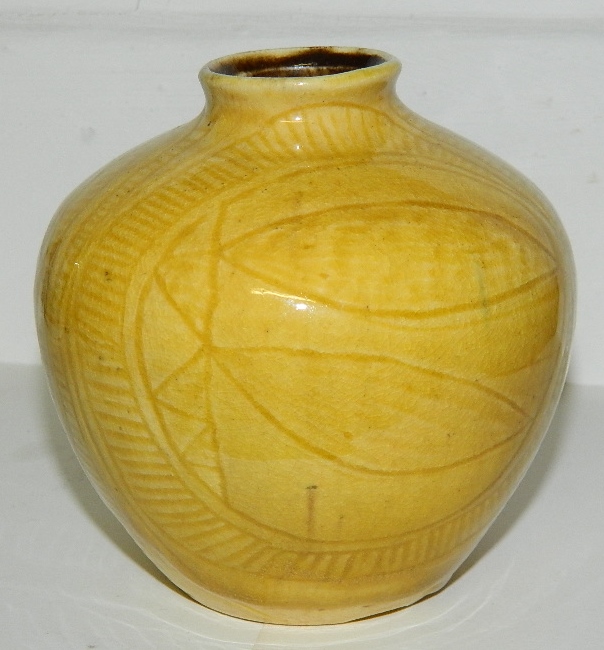 Vase i keramik af Peder Rasmussen. Gult glaseret med indridset dekoration herunder. Fremstår i god stand. Kunstnersignatur på bunden. 10½ cm høj. Diameter på 10 cm.