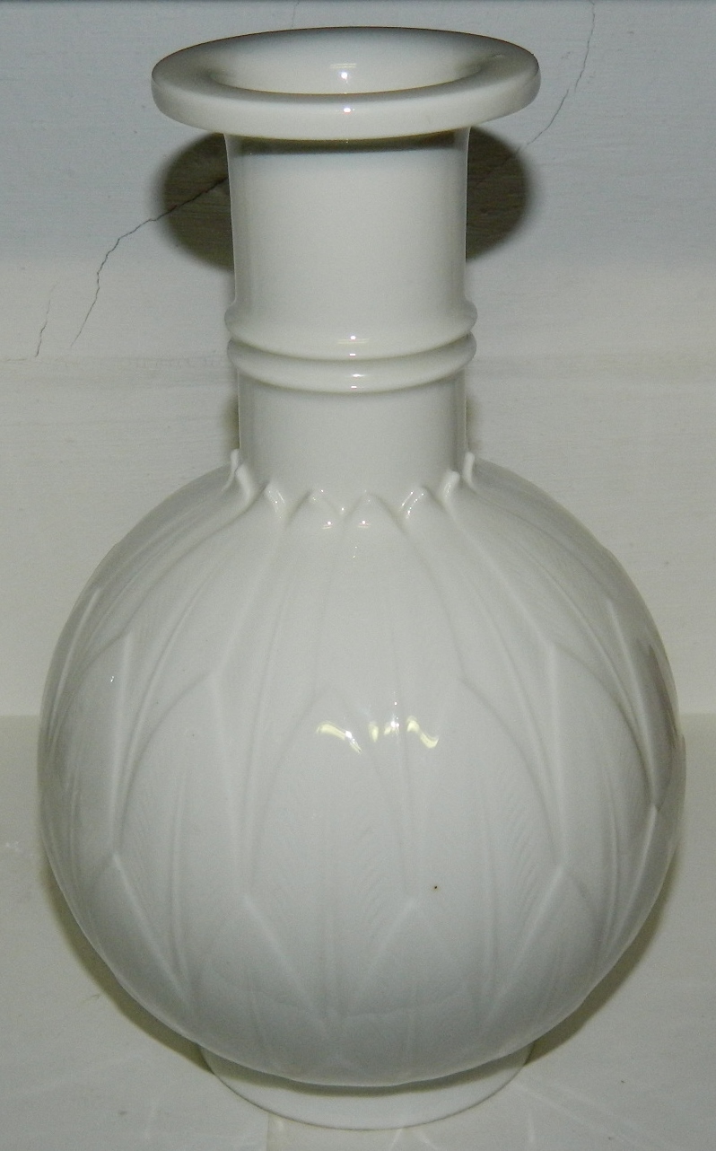 Vase i porcelæn af Arno Malinowski for Royal Copenhagen. Dekoreret med bladværk i relief. Kgl. 3309. Signeret med monogram. 2. sortering. Mindre "sandkorn" ses under glasuren på toppens overflade. 20 cm høj.