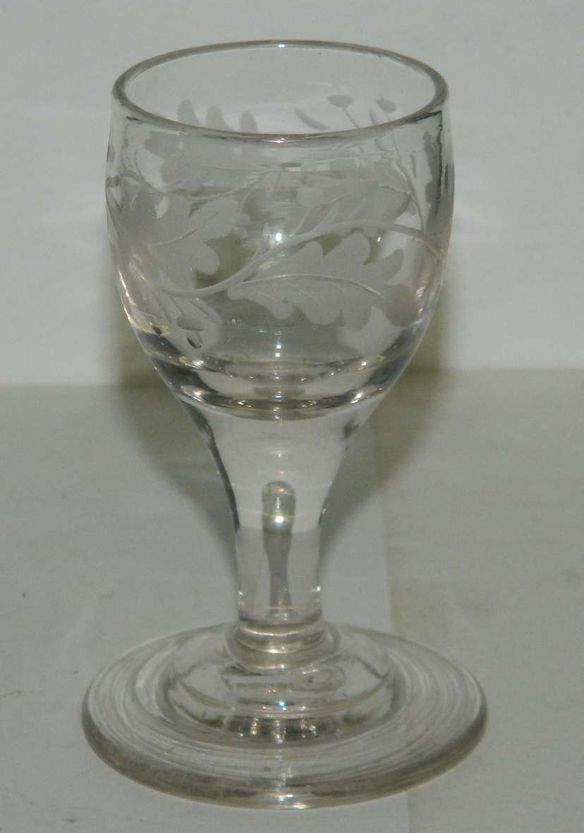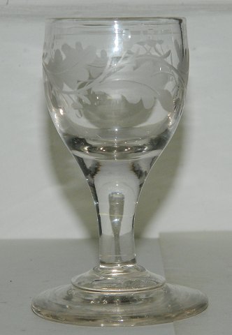 Gammelt glas med dekoration på kummen med egeløv fra omkring 1880. Fremstår i perfekt stand. Under foden er glasset anhæftet. 9 cm højt. Foden er 5½ cm i diameter.