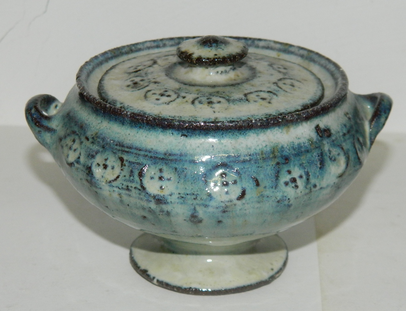 Lågskål i keramik af Gutte Eriksen. Underskål på fod - dekoreret med hanke. Stempeldekoration rundt om skålen. Fremstår i perfekt stand. Signeret af kunstneren på bunden. 10½ cm høj.