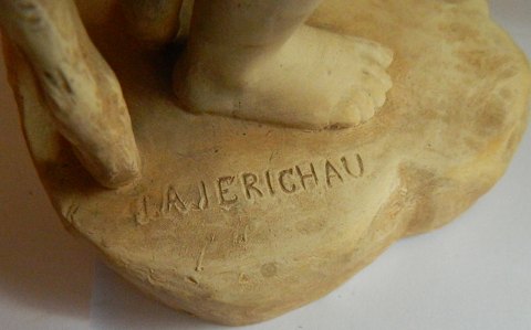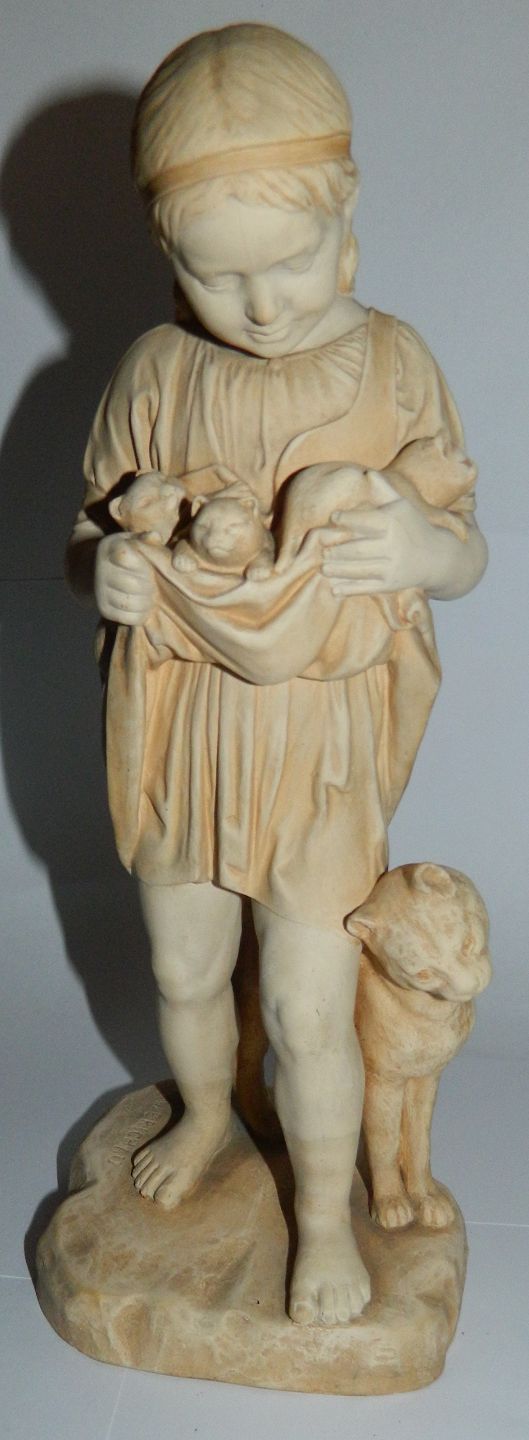 Figur i keramik af J. A. Jerichau: "Pige med killinger". Udført for P. Ipsen i slutningen af 19. århundrede. Fremstår i god stand med en par små skår. Ingen alvorlige skader eller reparationer. Fabriksmærket med P. IPSEN KJØBENHAVN samt modelnummer 703 og signeret af kunstneren. 27 cm høj. LIGNENDE KØBES