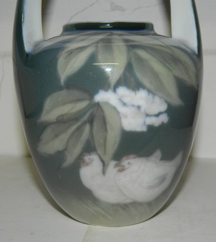 SKØNVIRKEPERIODEN: Krukke med høj hank fra Royal Copenhagen. modelnummer 915/29. Fremstillet mellem 1900-1923. Dekoreret med høns. Låget mangler. Fremstår i god stand. Ingen skader eller reparationer. 18½ cm høj.