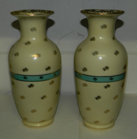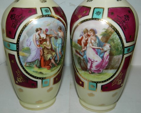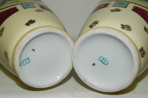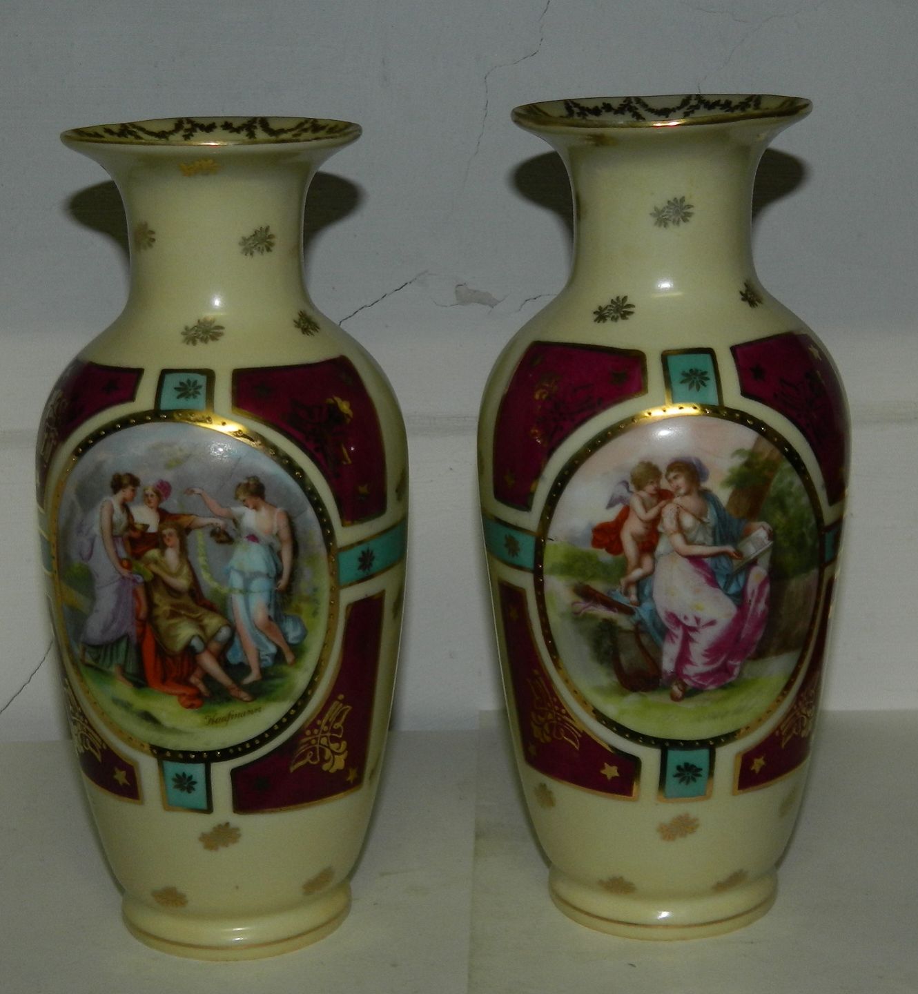 Par vaser i porcelæn fra Royal Vienna fabrikken i Østrig. Dekoreret med klassisk romantisk motiver. Fremstår i perfekt stand. Ingen skader eller reparationer. Fabriksmærkede på bunden. Det ene motiv signeret Kaufmann. 20 cm høje.